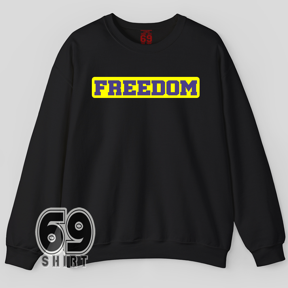 Make a statement without saying too much. The Freedom Shirt features strong varsity-style lettering in vibrant blue with a yellow outline — a minimal yet powerful expression of individuality and independence.
