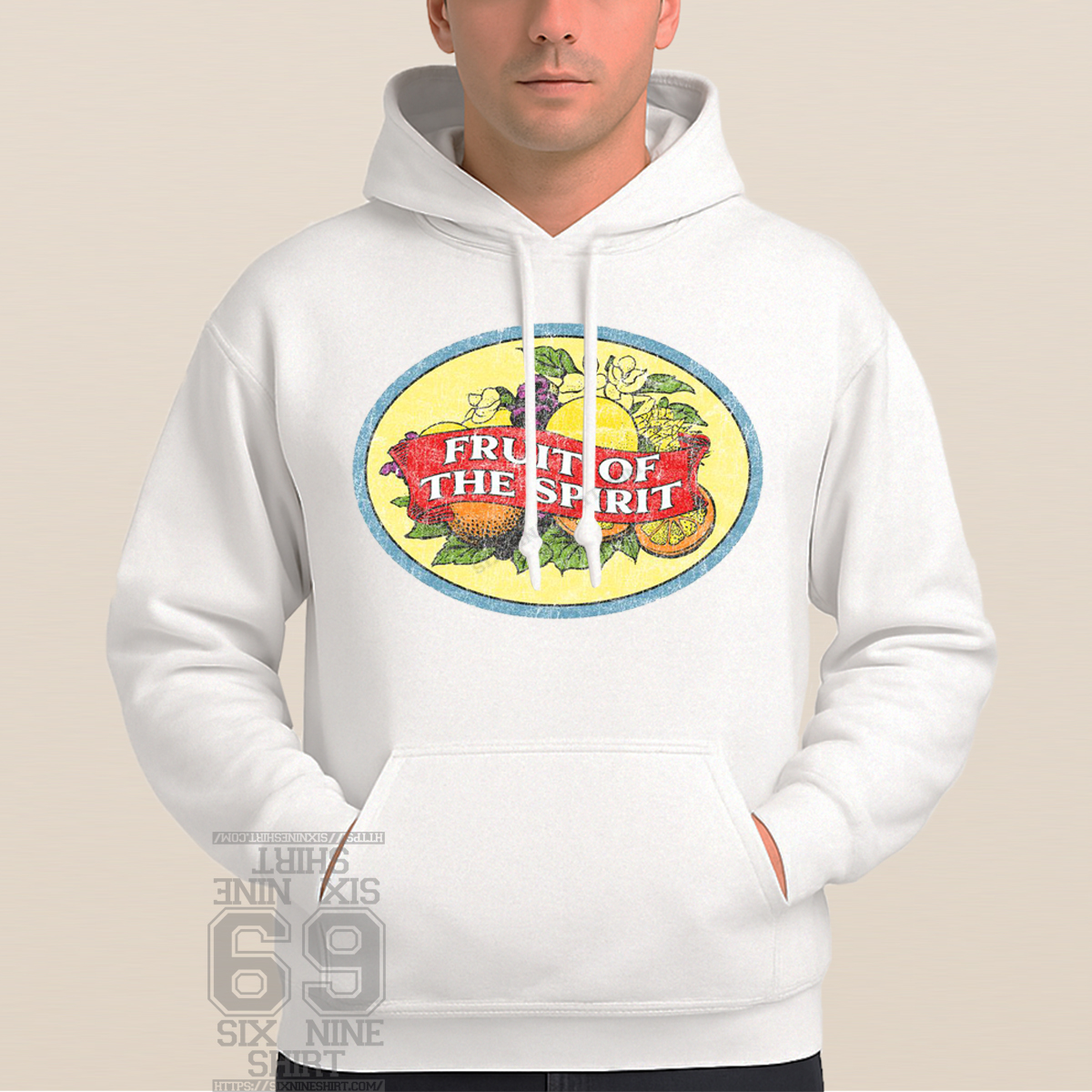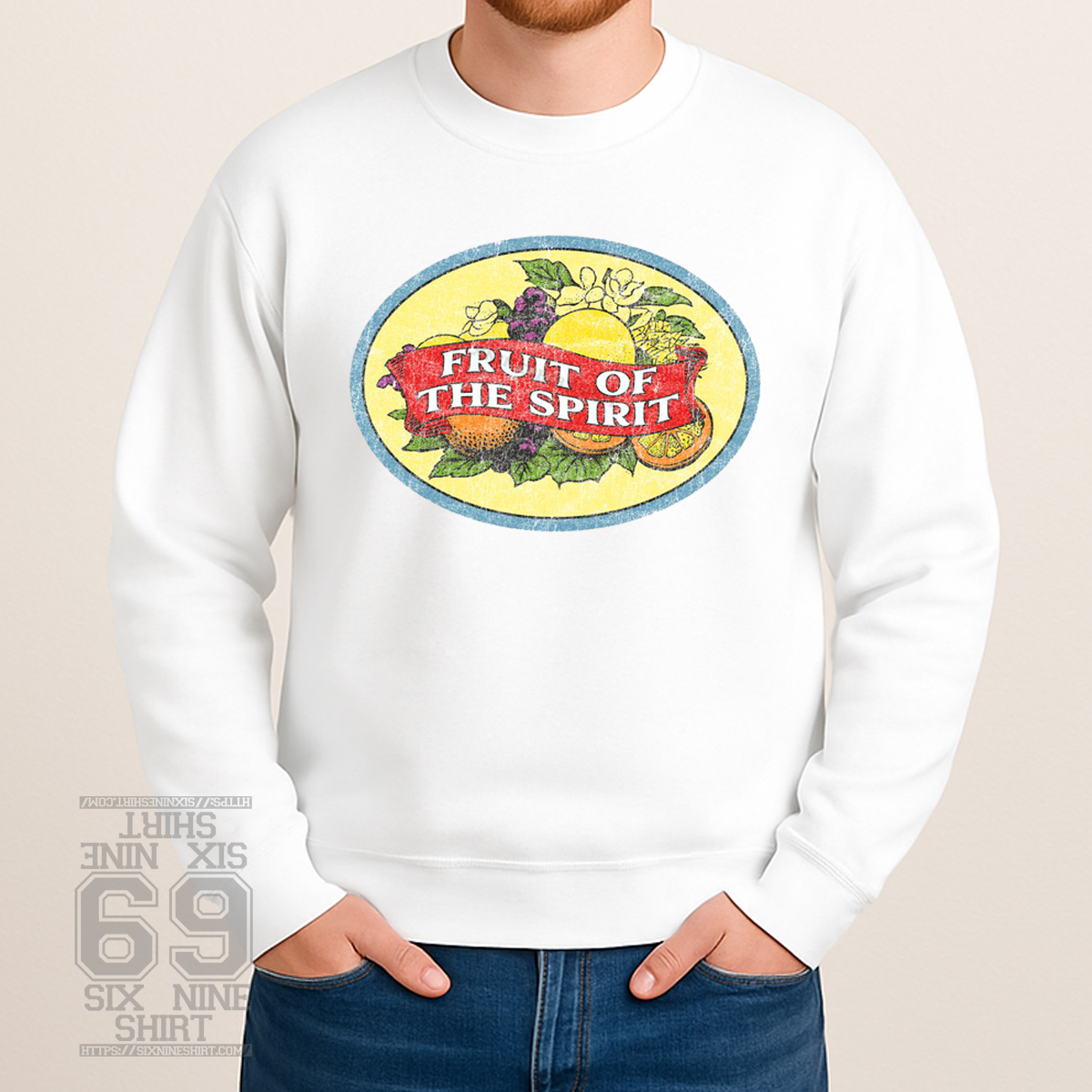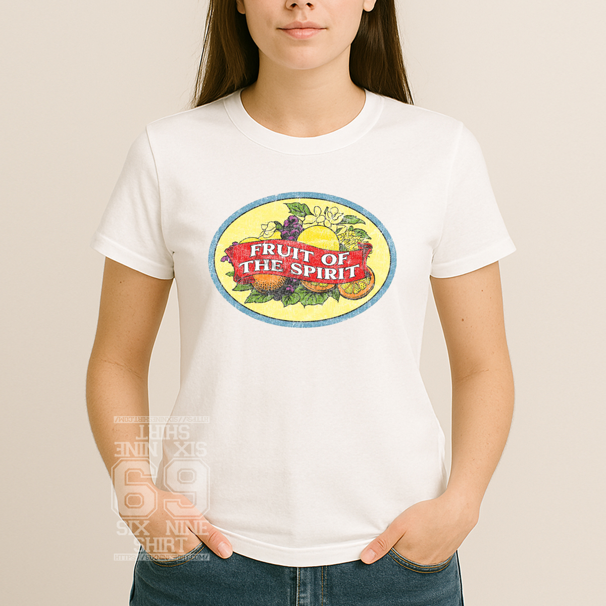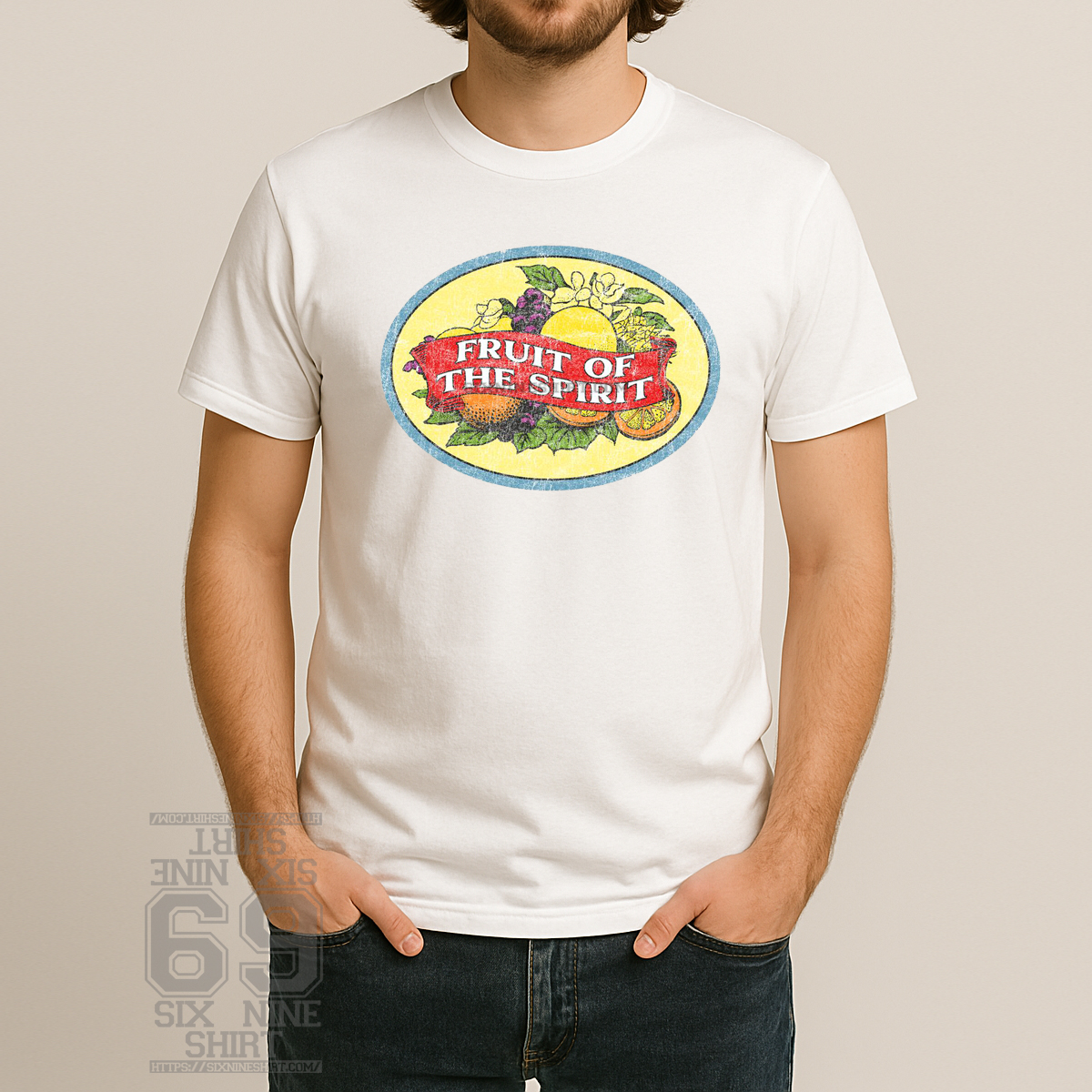 The Fruit of the Spirit Vintage Graphic T-Shirt features a retro oval emblem filled with colorful fruit and classic lettering, finished with a worn, distressed texture for an authentic old-school look. Inspired by traditional faith imagery and vintage apparel, this design blends meaningful symbolism with timeless style.