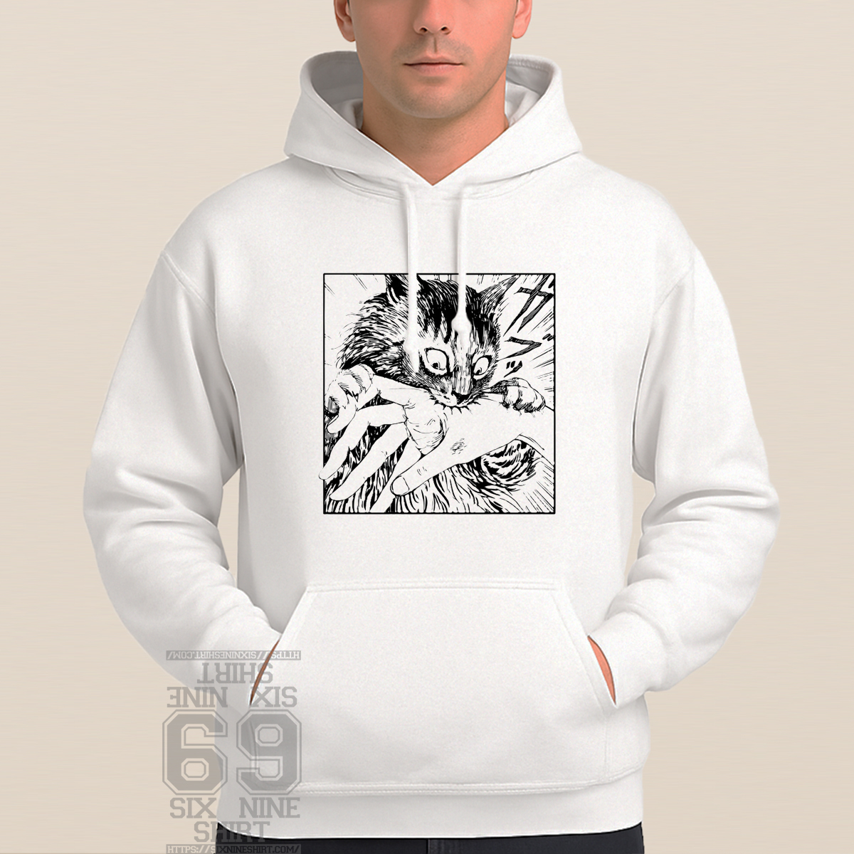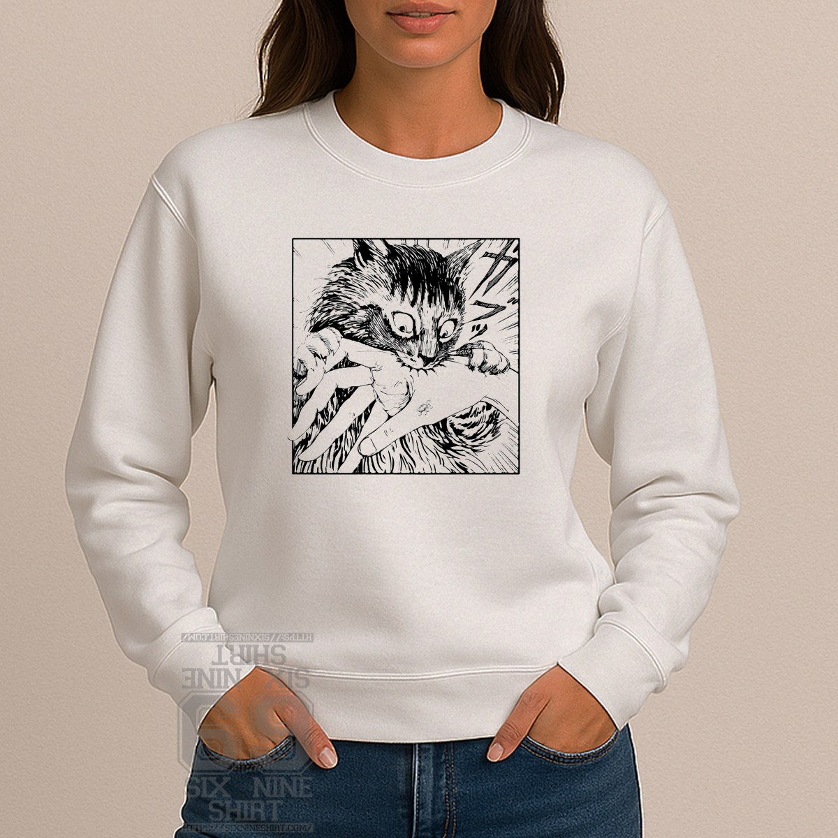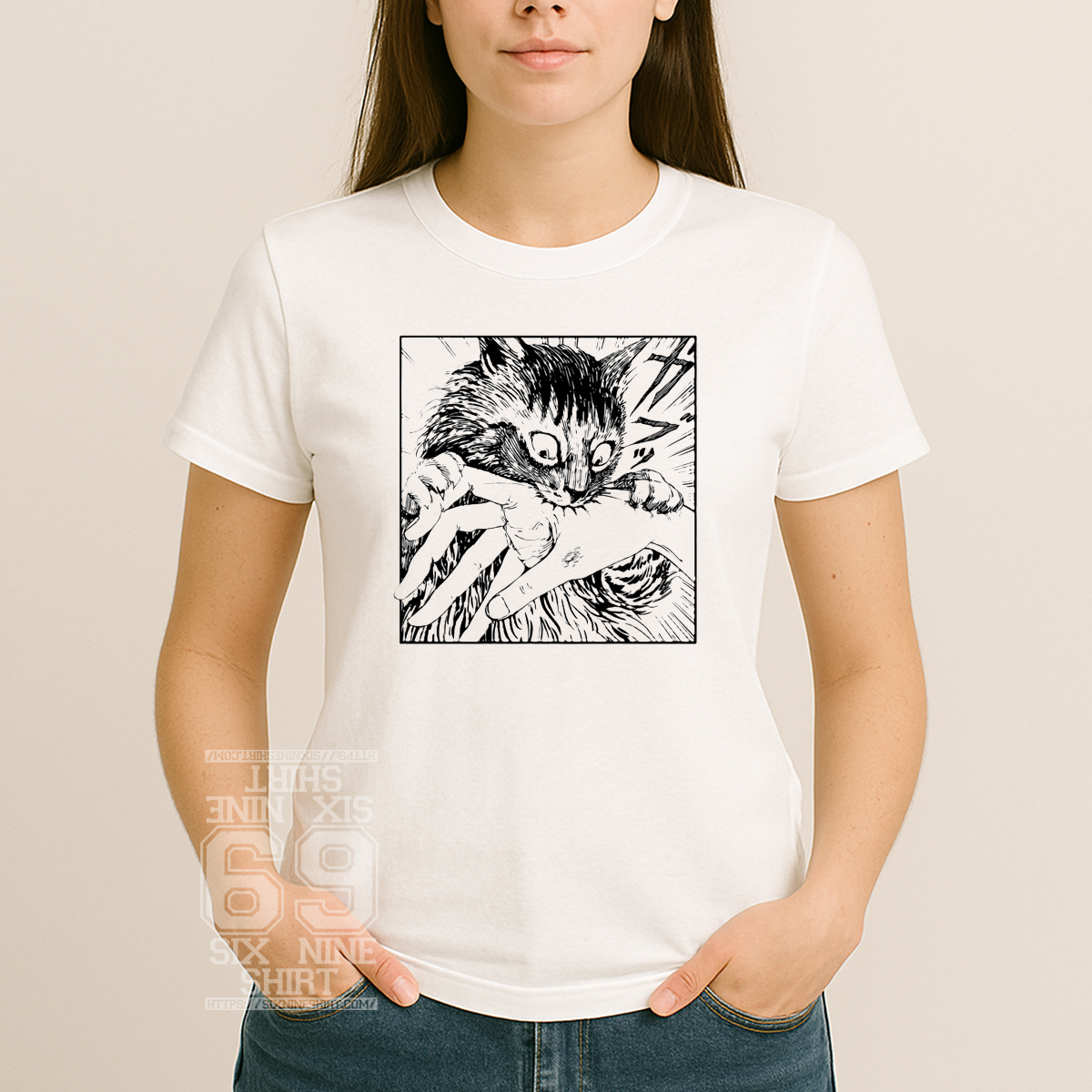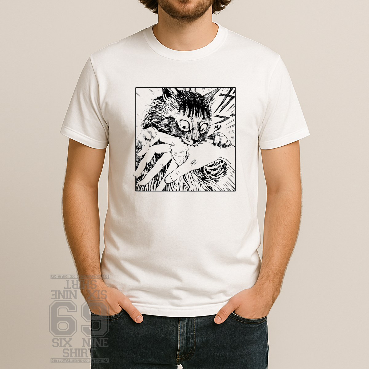This shirt features a dramatic manga-inspired design of a cat chomping on a hand, complete with expressive details that any anime or cat lover will appreciate. Perfect for fans of Japanese manga, pet owners, and anyone who has ever experienced a “playful” cat attack.