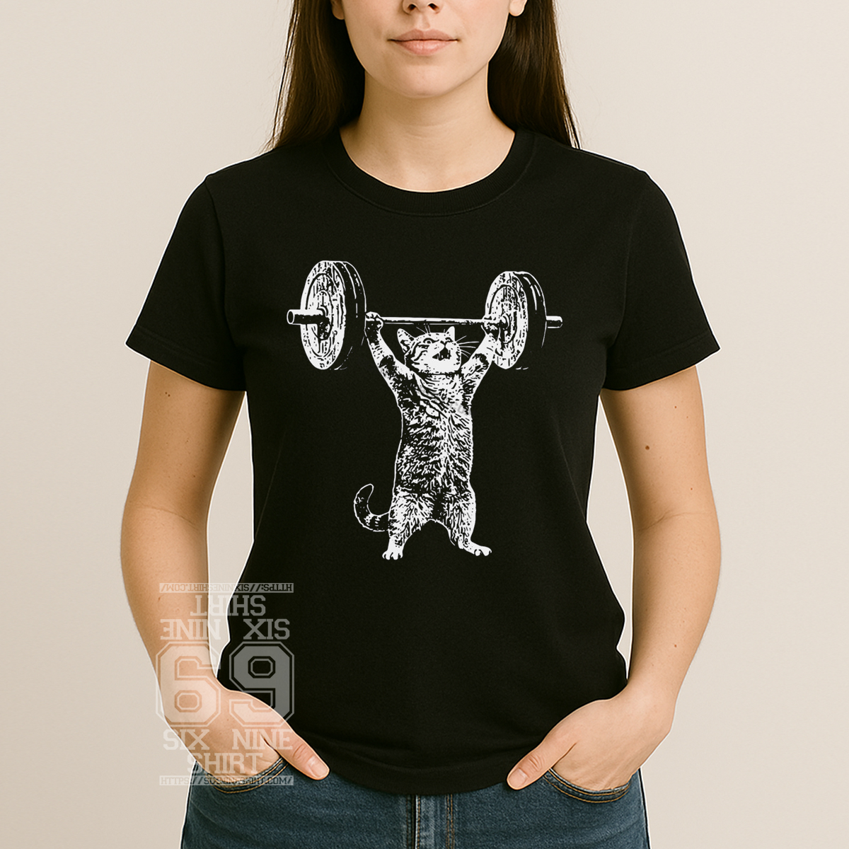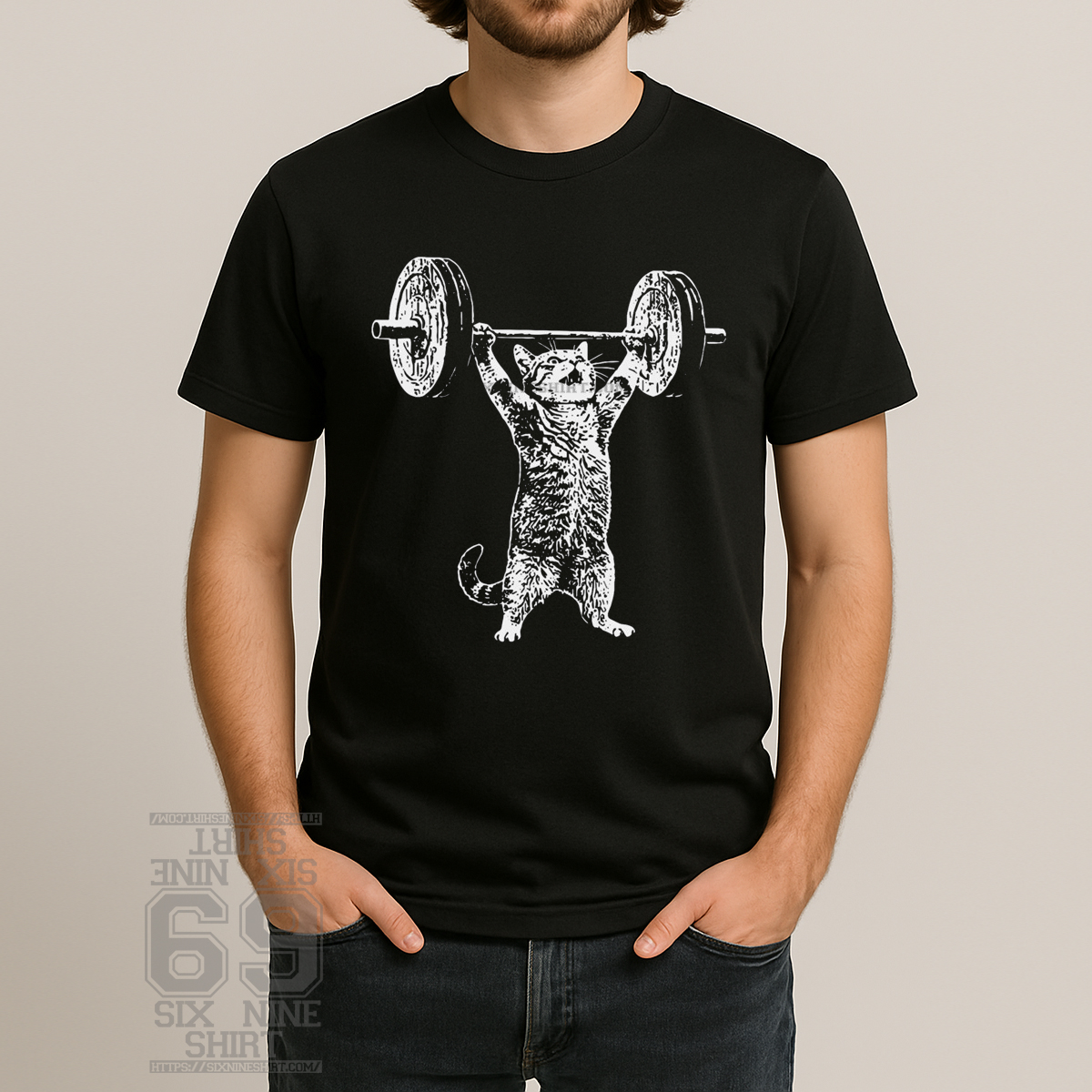 Funny Cat Lifting Weights Gym T-Shirt Graphic Workout Meme Tee