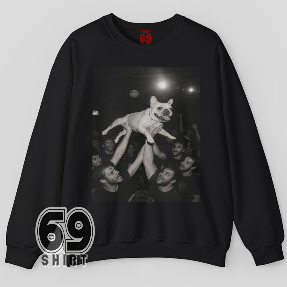 This bold and funny graphic tee captures the ultimate rock concert moment — a bulldog living its best life, crowd surfing above cheering fans.