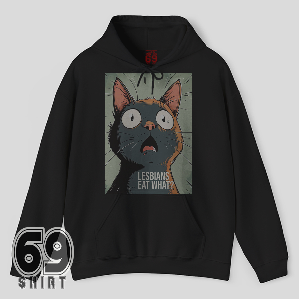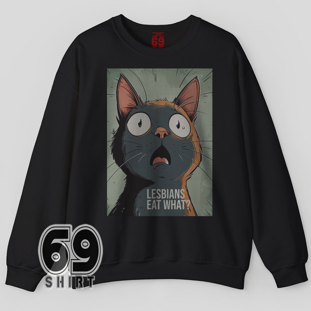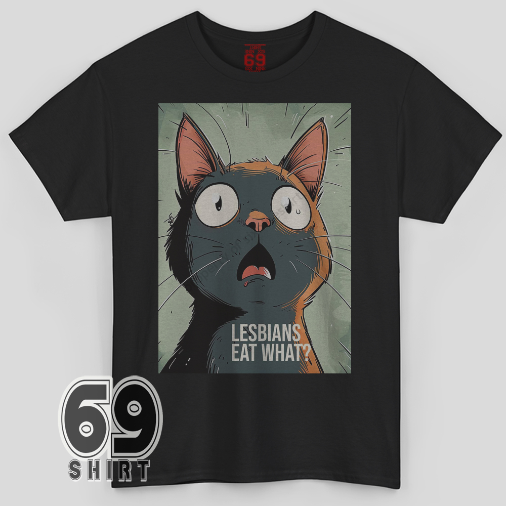 Get ready to turn heads and spark laughter with this hilarious “Lesbians Eat What?!” Cat T-Shirt. Featuring a wide-eyed cartoon cat in total shock, this tee perfectly captures that “did I just hear that right?” moment.