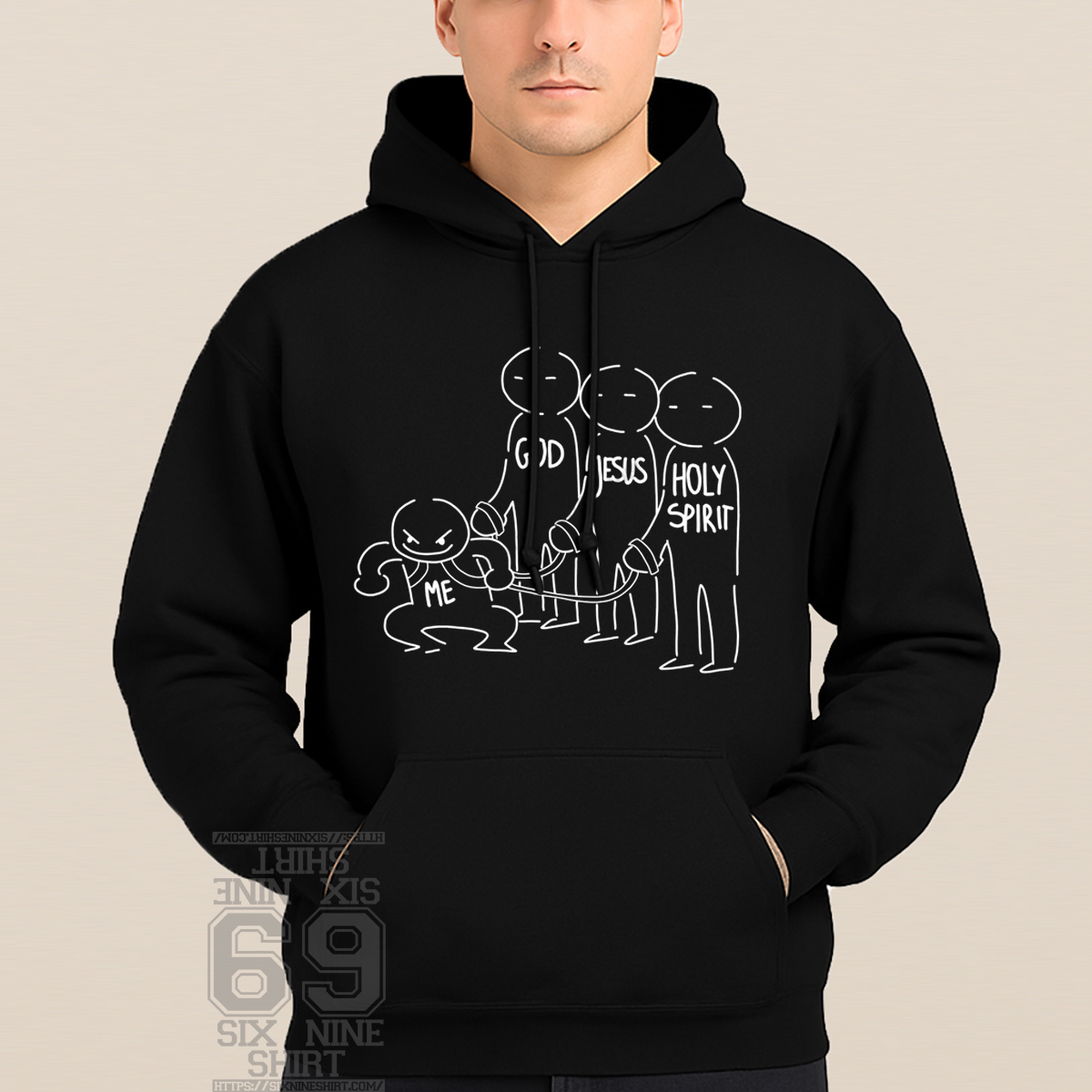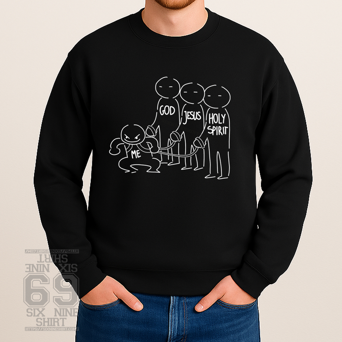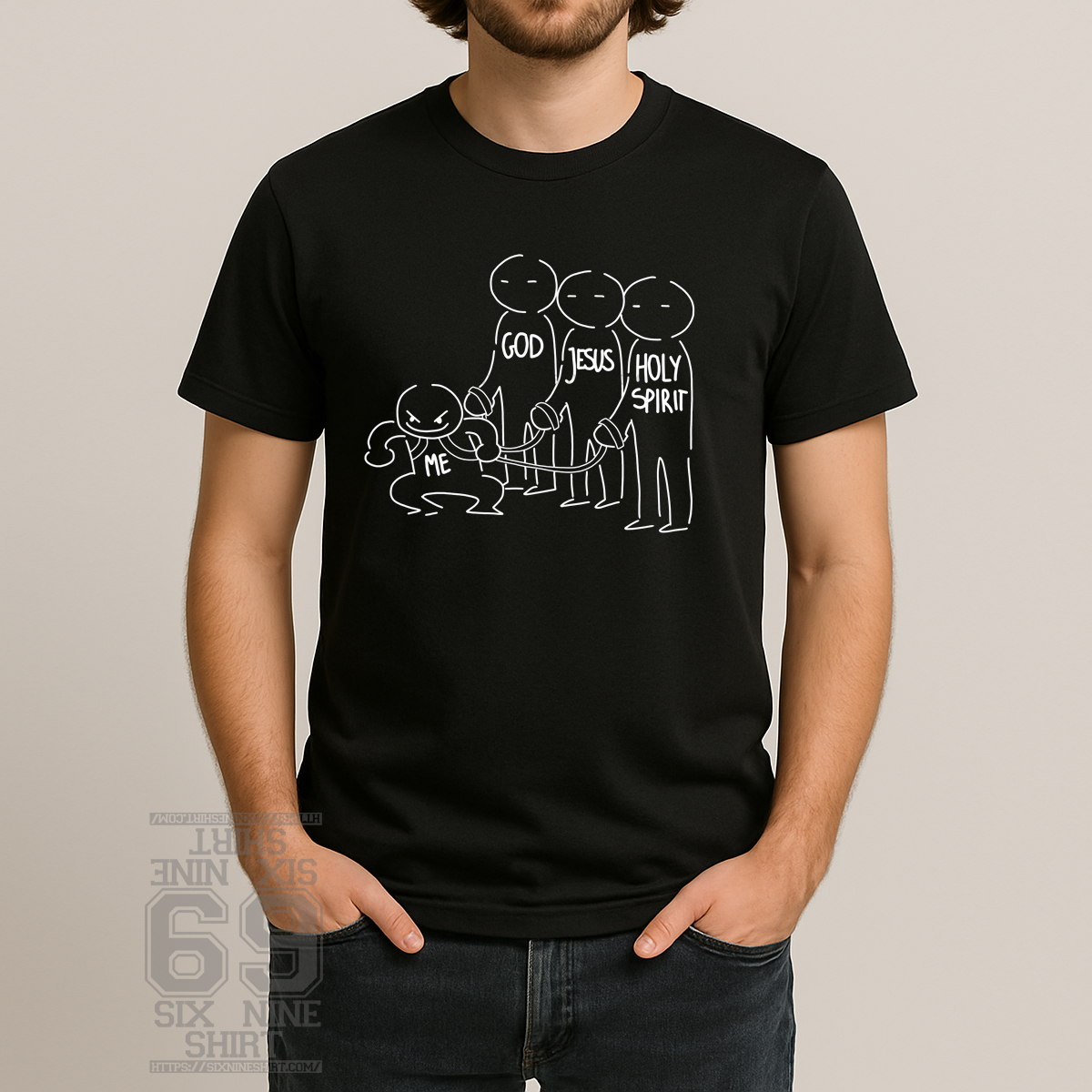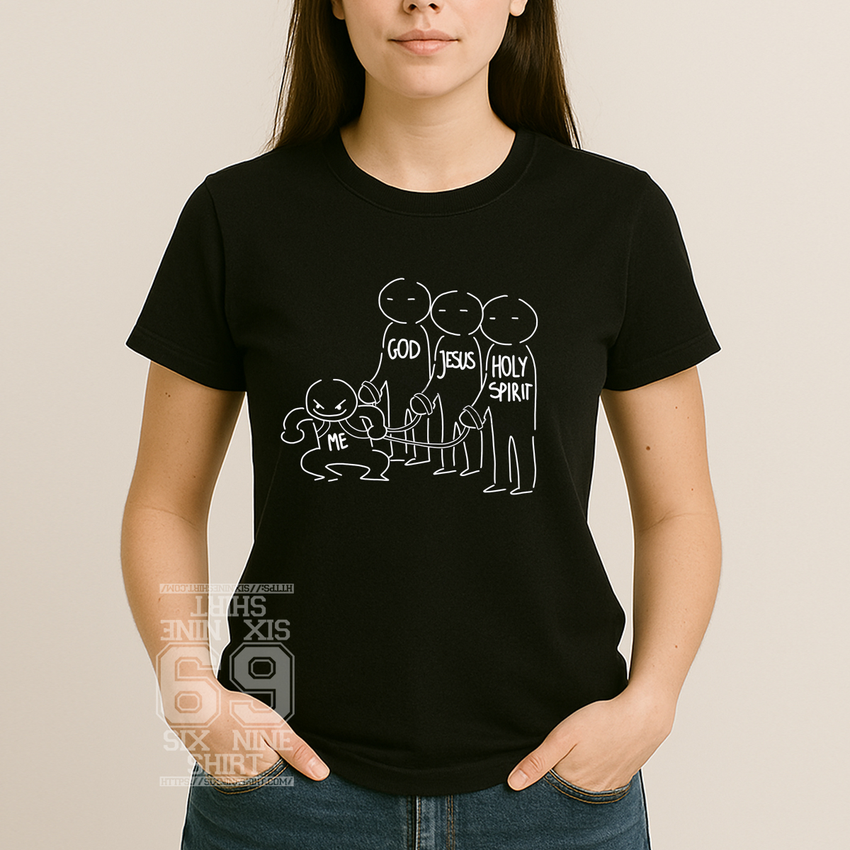 The contrast between the calm Trinity and the determined figure labeled “ME” makes this design relatable, modern, and deeply meaningful — perfect for daily wear or faith-based events.