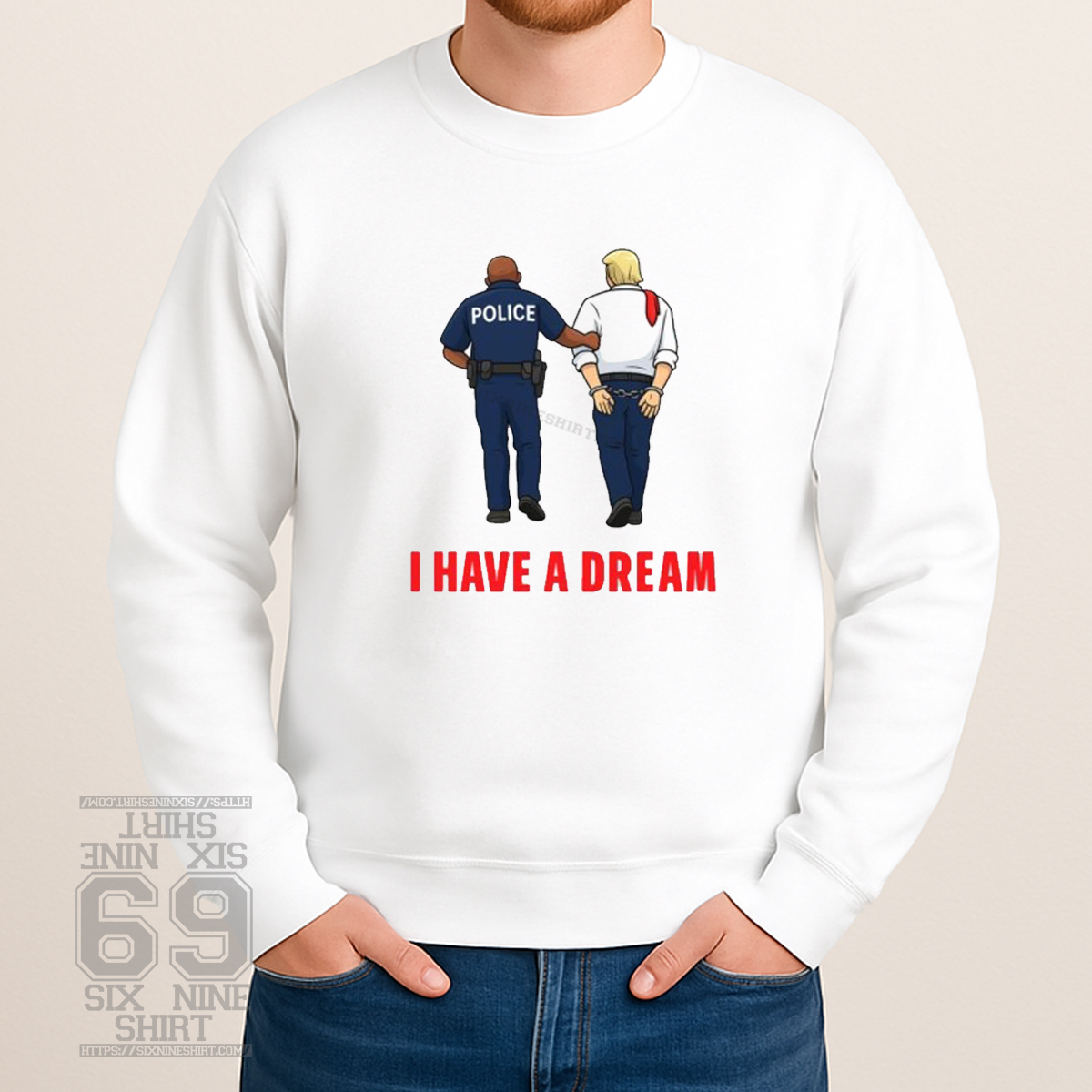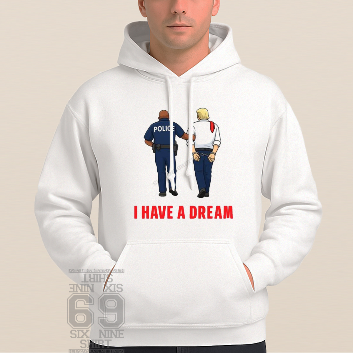 This graphic features a handcuffed political figure being escorted by police, paired with the ironic phrase “I HAVE A DREAM” — a sharp, controversial contrast that sparks conversation, debate, and attention. Whether you see it as protest art, dark humor, or anti-system expression, this design is made to stand out.