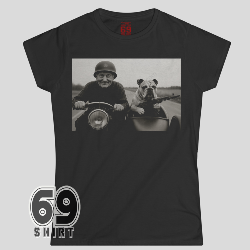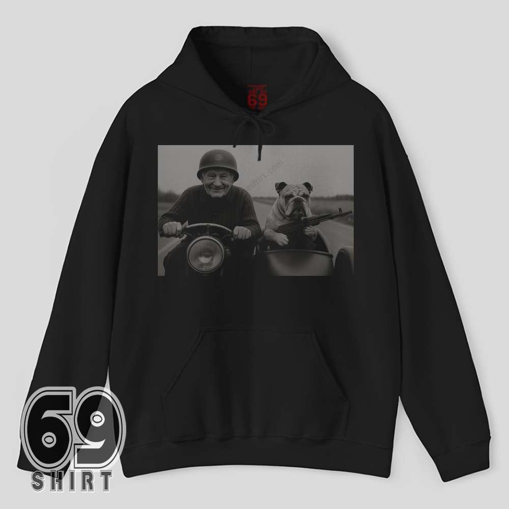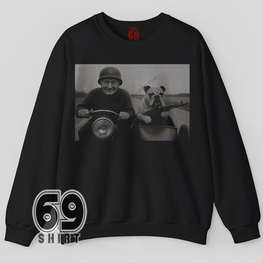 Kickstart your wardrobe with this Rebel Grandpa and His Badass Bulldog Graphic Tee, inspired by gritty vintage biker photography and dark humor. The design features an elderly rebel cruising confidently on an old-school motorcycle, while his loyal bulldog sits in the sidecar gripping a prop gun like the toughest sidekick on the planet.