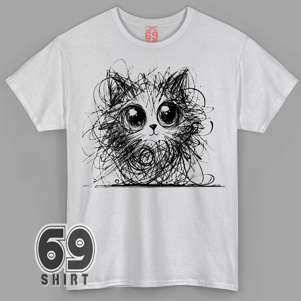 Funny chaotic cat tee — sketch-style drawing of a messy cute kitty with giant eyes. Perfect for cat lovers who thrive on creative chaos.