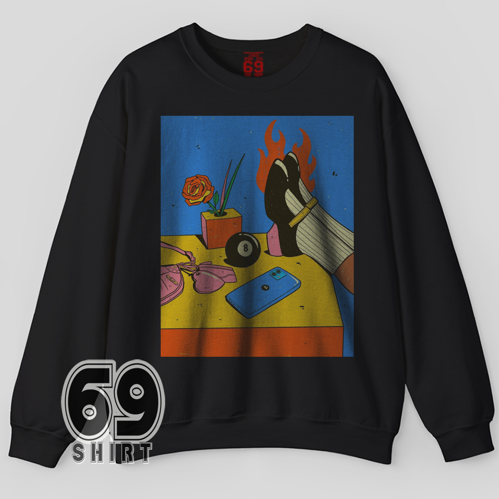 Step into a world of bold color and surreal retro style with the Flaming Heels & 8 Ball Shirt. Featuring a striking pop-art scene — high heels on fire, a rose in bloom, and classic 8-ball chaos — this design captures cool girl energy with a vintage edge.
