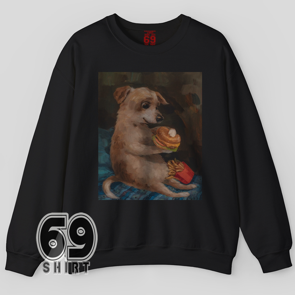 The blend of fine-art charm and modern humor makes this tee a standout conversation piece. Whether you’re a dog lover, burger fan, or just appreciate quirky, creative fashion, this shirt delivers personality in every thread.