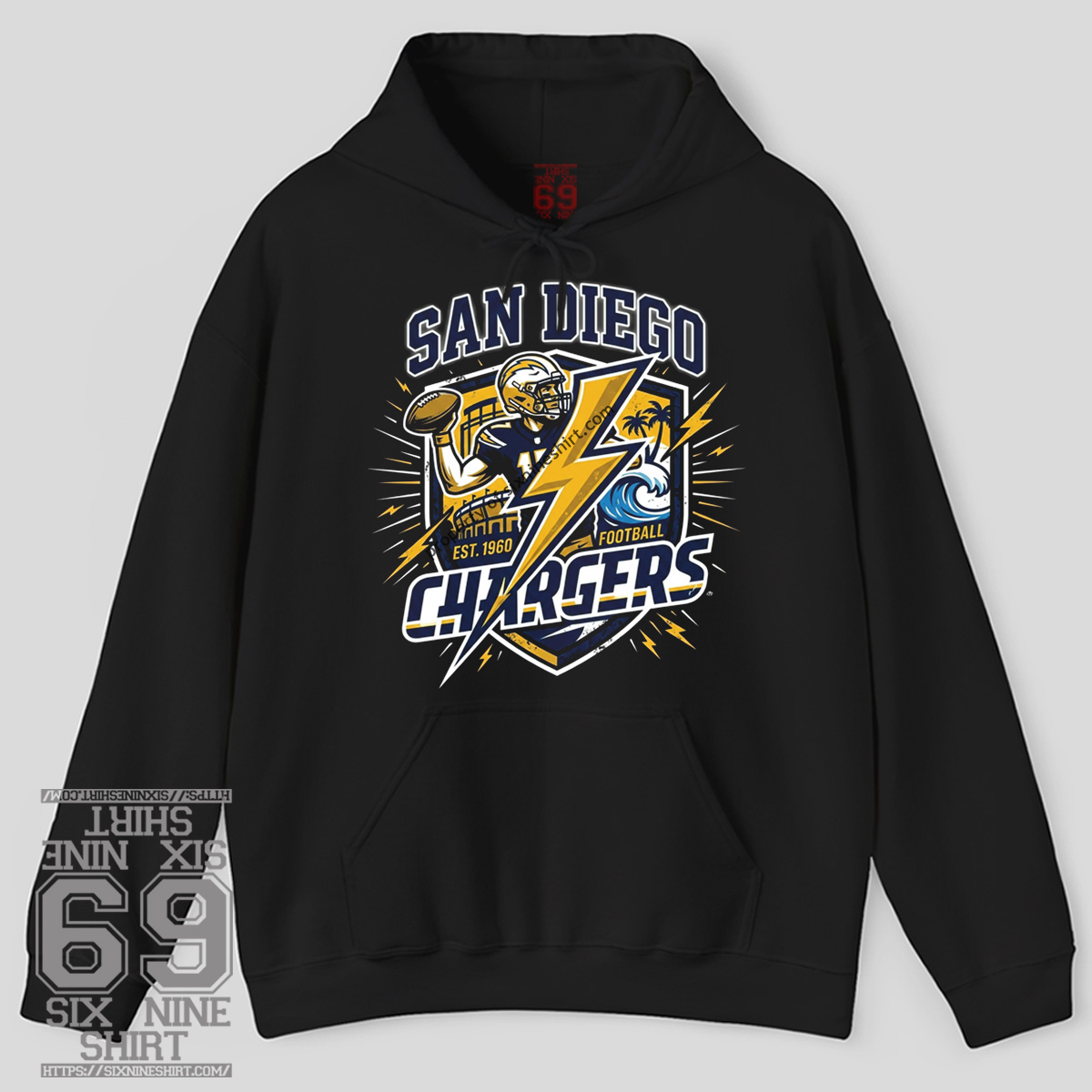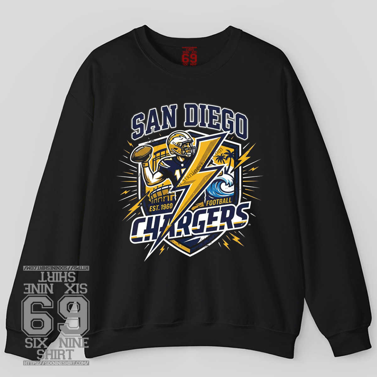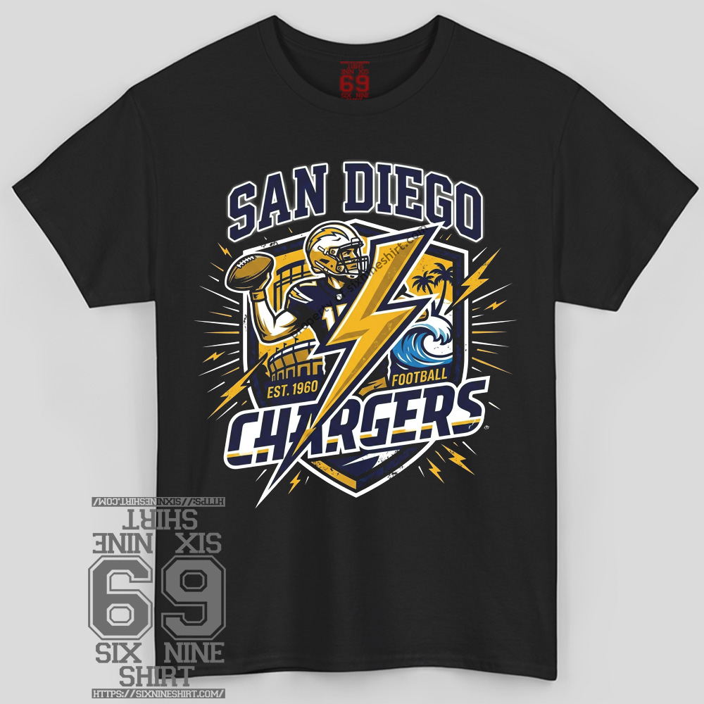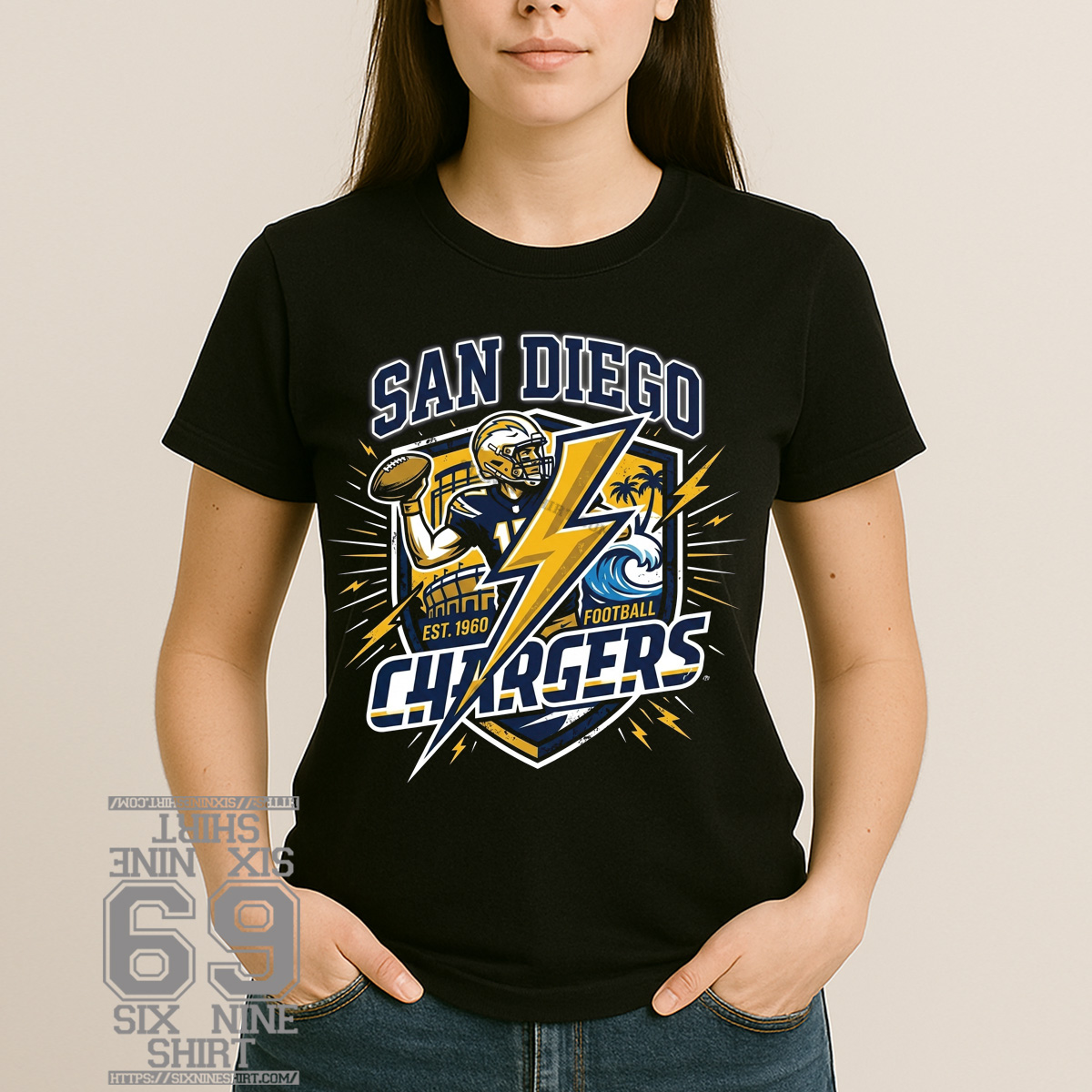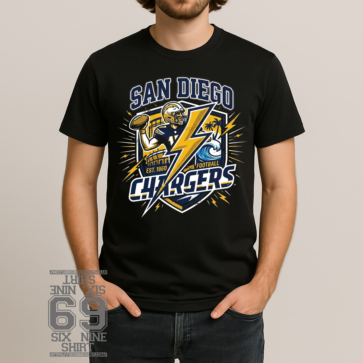 Inspired by the iconic legacy of the Los Angeles Chargers, this shirt features a bold lightning bolt, quarterback artwork, and California-themed elements that bring nostalgic football vibes to life.